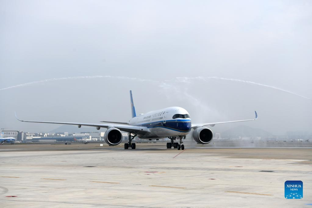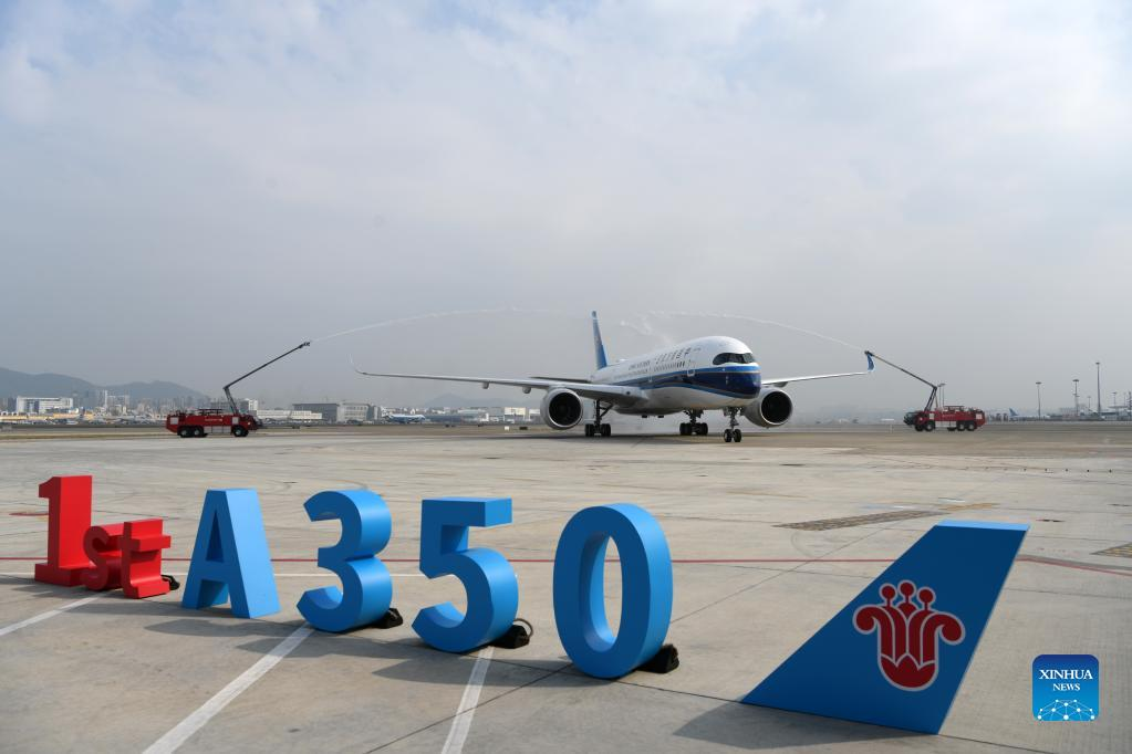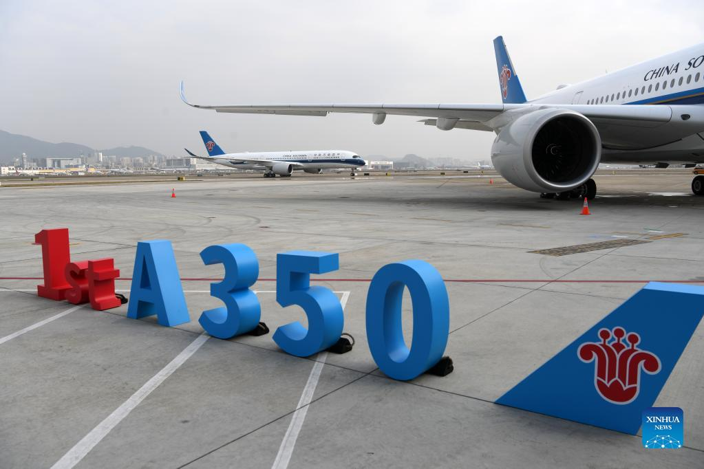 An Airbus A350-900 arrives at the Baoan International Airport in Shenzhen, south China's Guangdong Province, Jan. 6, 2022. China Southern Airlines launched two new Airbus A350-900 in Shenzhen on Thursday. The new aircraft will mainly serve domestic routes between Beijing Daxing International Airport, Shanghai and Chengdu. (Xinhua/Liang Xu)