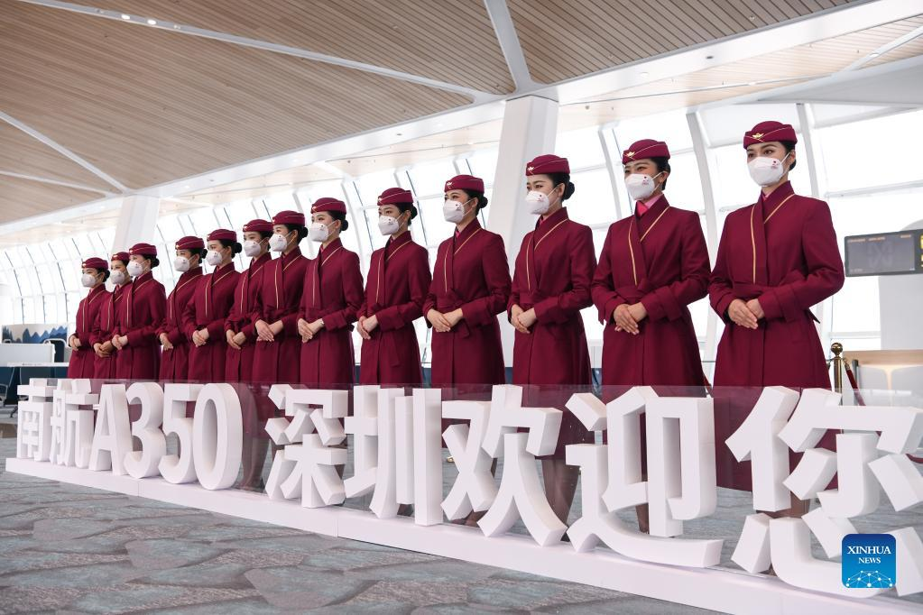Photo taken on Jan. 6, 2022 shows a welcome ceremony for Airbus A350-900 at the Baoan International Airport in Shenzhen, south China's Guangdong Province. China Southern Airlines launched two new Airbus A350-900 in Shenzhen on Thursday. The new aircraft will mainly serve domestic routes between Beijing Daxing International Airport, Shanghai and Chengdu. (Xinhua/Liang Xu)