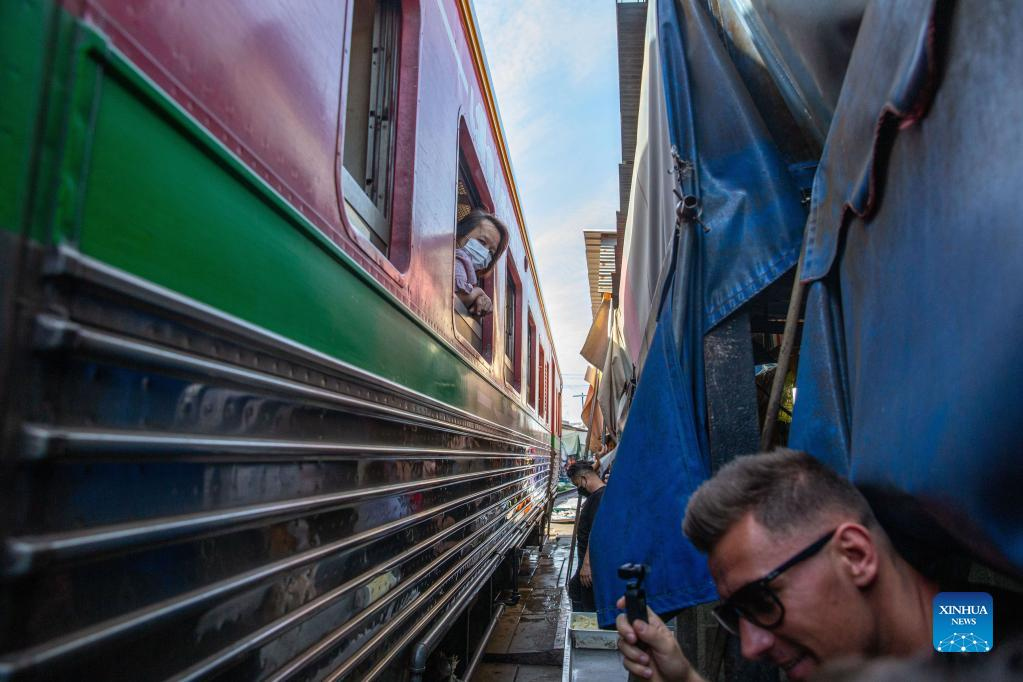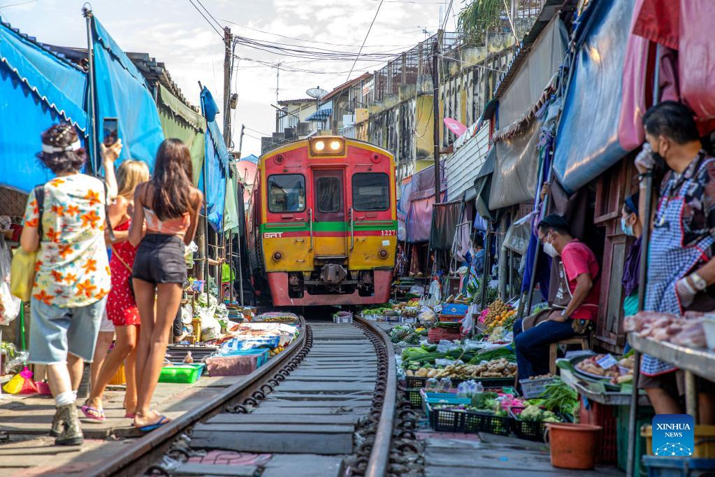 A commuter train runs through Maeklong Railway Market in Samut Songkhram Province, Thailand, Jan. 5, 2022. In Maeklong Railway Market, built along a railway track, a compromise is reached between vendors and passing commuter trains. When the rail track is clear, stall owners can set up stalls at will. Before the COVID-19 pandemic, the market had attracted many tourists. Nowadays, due to the decrease of passengers, the number of trains that shuttle here every day has been reduced from eight to two. (Xinhua/Wang Teng)
