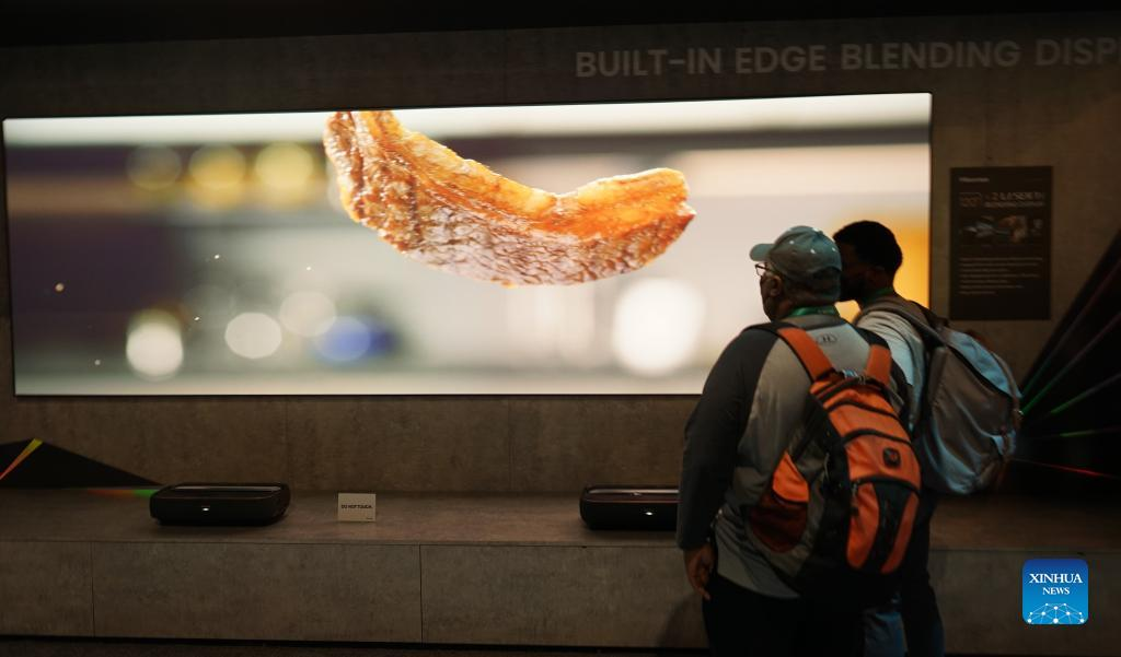 Visitors view a newest TV at the exhibition area of Hisense, a Chinese consumer electronics and appliance manufacturer, during the 2022 Consumer Electronics Show (CES) in Las Vegas, the United States, Jan. 5, 2022. The 2022 CES, scheduled from Jan. 5 to 7, drew more than 2,300 exhibitors, including 800 startups, as well as hundreds of thought leaders. (Photo by Zeng Hui/Xinhua)