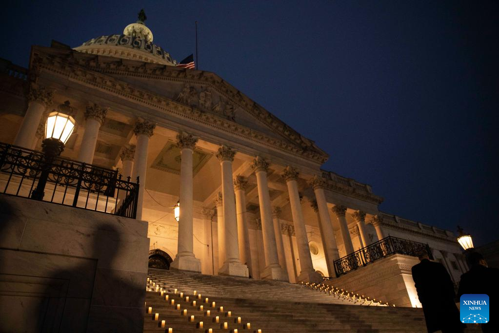 A U.S. national flag flies at half-staff and candles are lit at the U.S. Capitol Building to mark the anniversary of the Jan. 6 attack on the Capitol in Washington, D.C., the United States, Jan. 6, 2022. (Photo by Aaron Schwartz/Xinhua)