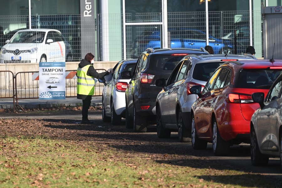 People in their vehicles wait at a drive-thru COVID-19 test site in Bologna, Italy, Dec. 31, 2021. (Photo by Gianni Schicchi/Xinhua)