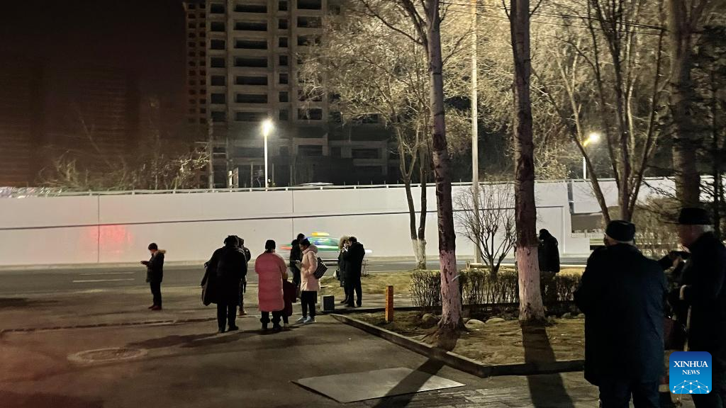 People stand outside the buildings to escape the earthquake in Xining, northwest China's Qinghai Province, Jan. 8, 2022. (Xinhua/Li Ning)