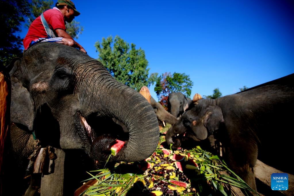 Elephants eat fruit and vegetables at the Wingabaw Elephant Camp in Bago region, Myanmar, on Jan. 7, 2022. (Xinhua/U Aung)