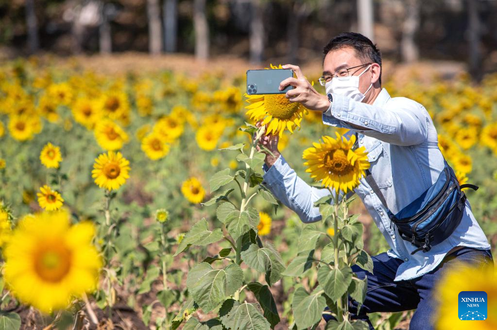 A tourist takes pictures in sunflower fields in Lopburi, Thailand, Jan. 6, 2022. Lopburi province is famous for a large sunflower plantation in Thailand. From November to January, the golden sunflower fields attract many tourists. (Xinhua/Wang Teng)
