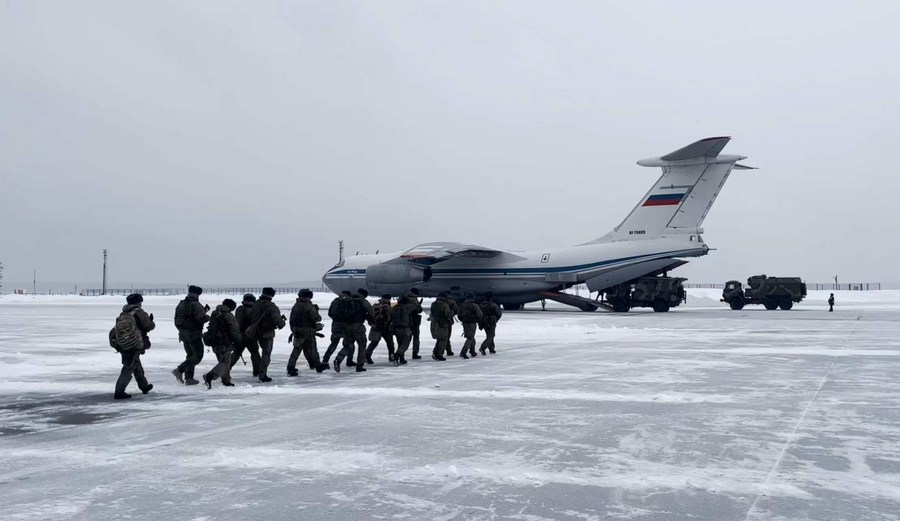 Screenshot taken on Jan. 6, 2022 shows soldiers boarding a military transport aircraft at the Chkalovsky airfield on the outskirts of Moscow, Russia. (The Russian Defense Ministry/Handout via Xinhua)