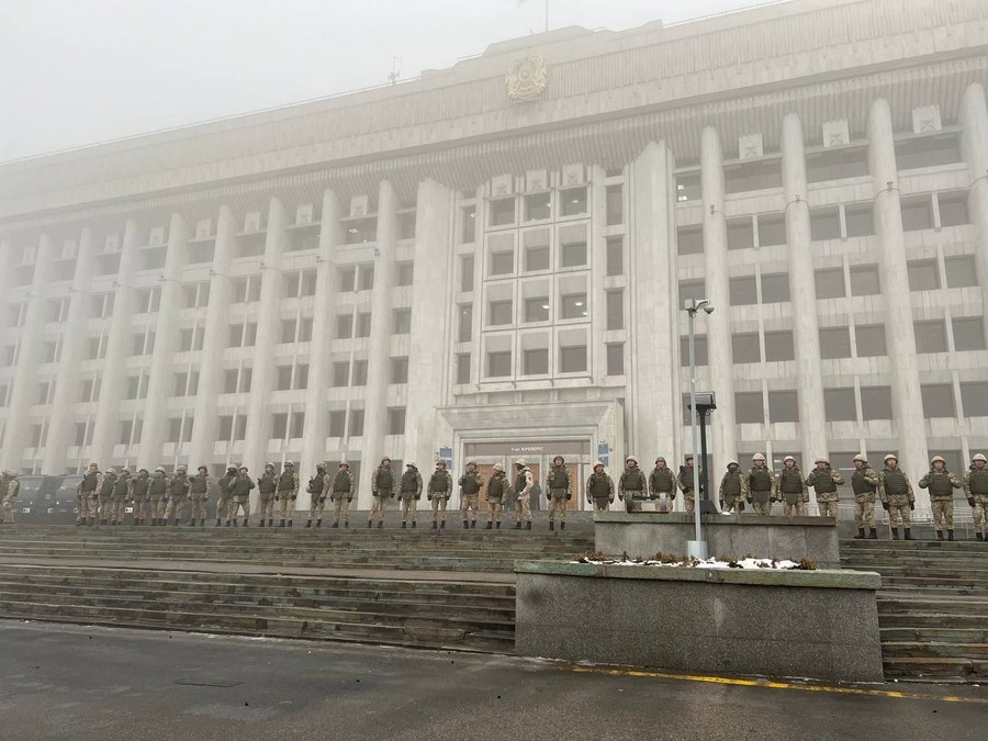 Security forces stand guard in front of the city hall in Almaty, Kazakhstan on early morning of Jan. 5, 2022. (Xinhua)