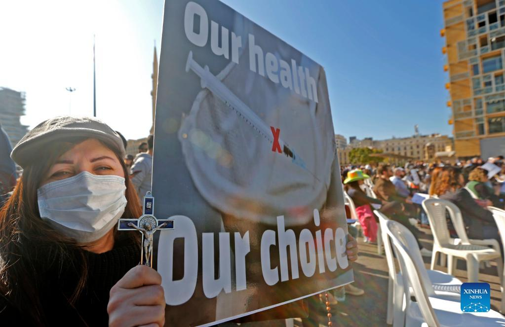 A protester holds a placard at Martyrs' Square in central Beirut, Lebanon on Jan. 8, 2022. Dozens of Lebanese gathered at Martyrs' Square in central Beirut, Lebanon on Saturday, refusing to have vaccinations and demanding freedom of choice amid surge in COVID-19 cases in the country. Meanwhile, with 7,547 new COVID-19 cases registered nationwide on Saturday, the COVID-19 Omicron wave that started three weeks ago in Lebanon has turned into a "tsunami," warned the country's Health Minister Firas Abiad. The national tally now stood at 769,400, and 17 more people died from the disease, bringing the country's death toll to 9,267, the ministry reported. (Xinhua/Bilal Jawich)