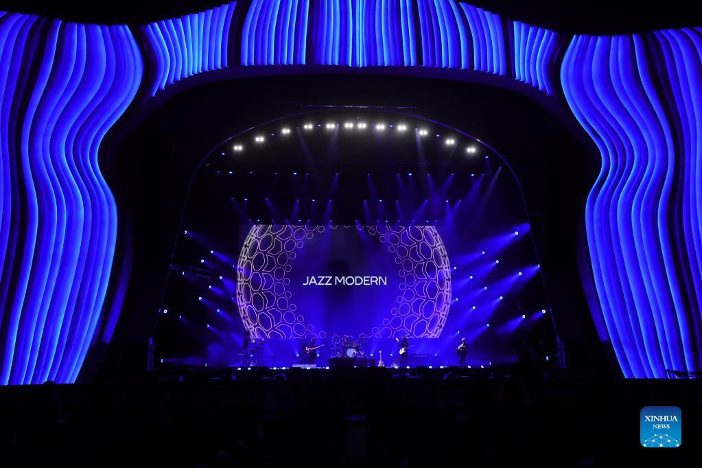 Musicians perform at the Expo 2020 Dubai in Dubai, the United Arab Emirates, on Jan. 9, 2022. As night falls on Expo 2020 Dubai, everything is just getting more fantastic. The cool breeze caresses the faces of visitors, healing them from a day of fatigue and breathing refreshing joviality into them. According to official data, Expo 2020 Dubai recorded 8,958,132 visits from Oct. 1 to Dec. 31, 2021. (Xinhua/Wang Dongzhen)