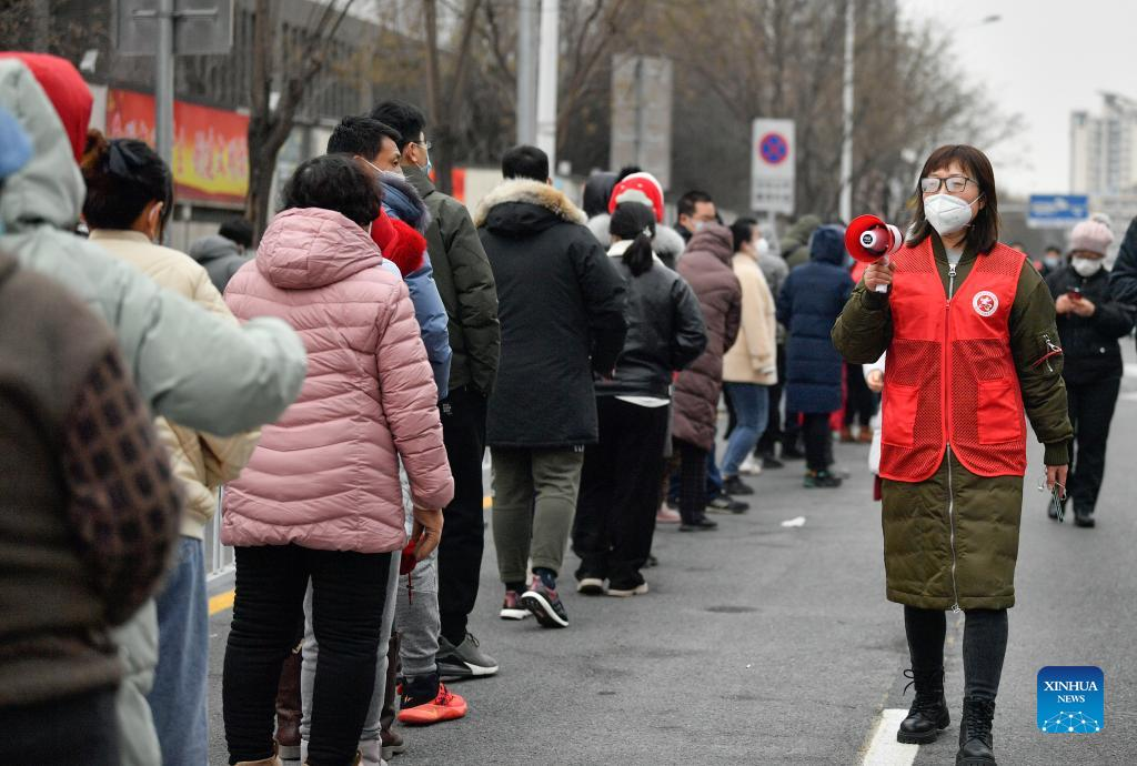 A volunteer (R) gives citizens tips on nucleic acid test at a testing site in Nankai District, north China's Tianjin, Jan. 9, 2022. North China's Tianjin, a municipality that neighbors Beijing, has decided to start a citywide nucleic acid testing after 20 people tested positive for COVID-19, authorities said Sunday. The infections were reported from 6 p.m. Friday to 9 p.m. Saturday in Jinnan District, and the gene sequencing found the first two locally transmitted confirmed cases were infected with the VOC/Omicron variant, according to the municipal headquarters for COVID-19 prevention and control. (Xinhua/Sun Fanyue)