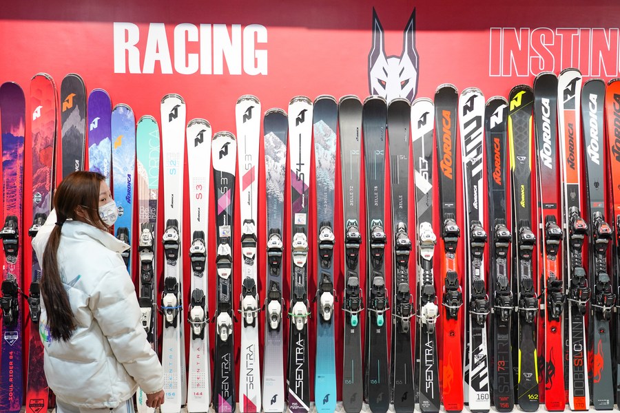 A staff member introduces skis at sports brand Nordica store in Beijing, capital of China, Jan. 6, 2022. (Xinhua/Chen Zhonghao)