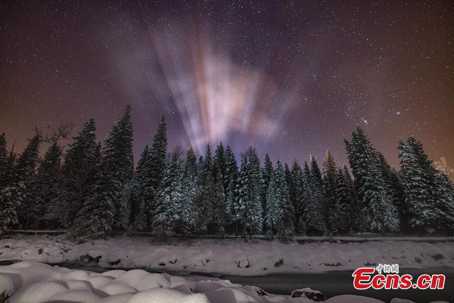 Photo shows the colored light pillars in Kanas scenic area of Altay, northwest China's Xinjiang Uyghur Autonomous Region. (Photo: China News Service/Cai Shi)