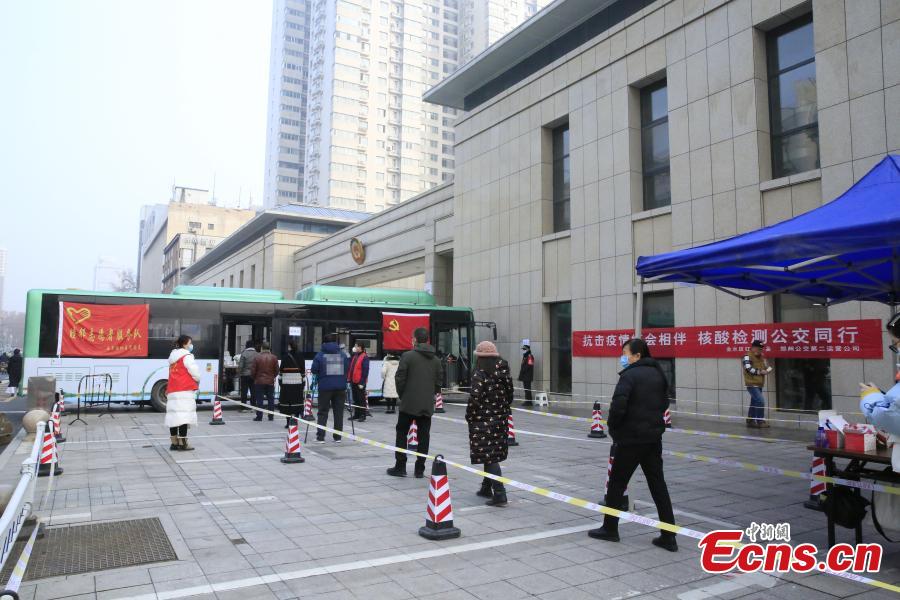 Local residents queue for throat swab COVID-19 testing in front of a bus in Zhengzhou, capital of central China’s Henan Province, Jan. 9, 2022. (Photo: China News Service/Zhu Manjie)