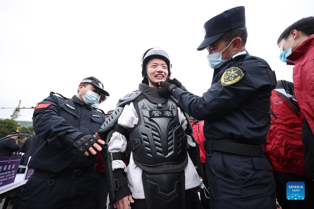 Police officers display police equipments in Xiangtan City, central China's Hunan Province, Jan. 10, 2022. Activities were held to mark the second Chinese People's Police Day, which falls on Monday. (Xinhua/Chen Zeguo)