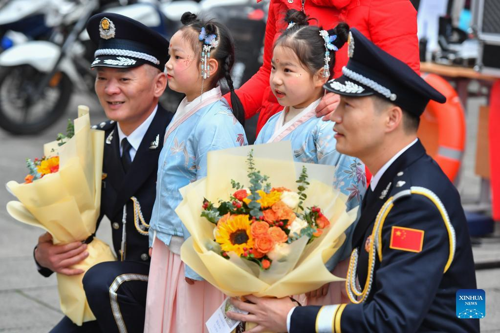 Children pose for photos with police officers in Xiangtan City, central China's Hunan Province, Jan. 10, 2022. Activities were held to mark the second Chinese People's Police Day, which falls on Monday. (Xinhua/Chen Zeguo)