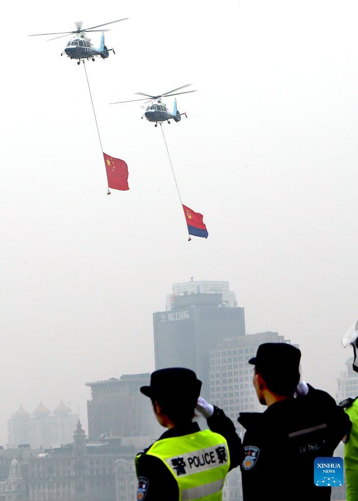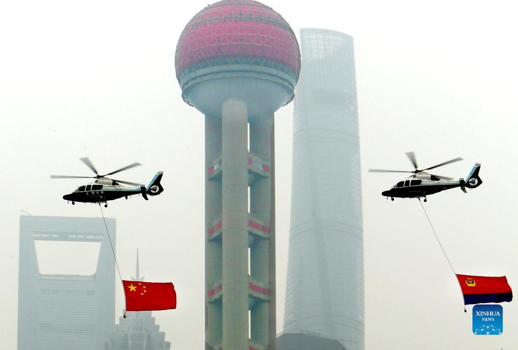 Photo taken on Jan. 10, 2022 shows the Chinese national flag and the police flag hanging on helicopters in east China's Shanghai. Activities were held to mark the second Chinese People's Police Day, which falls on Monday. (Xinhua/Fan Jun)