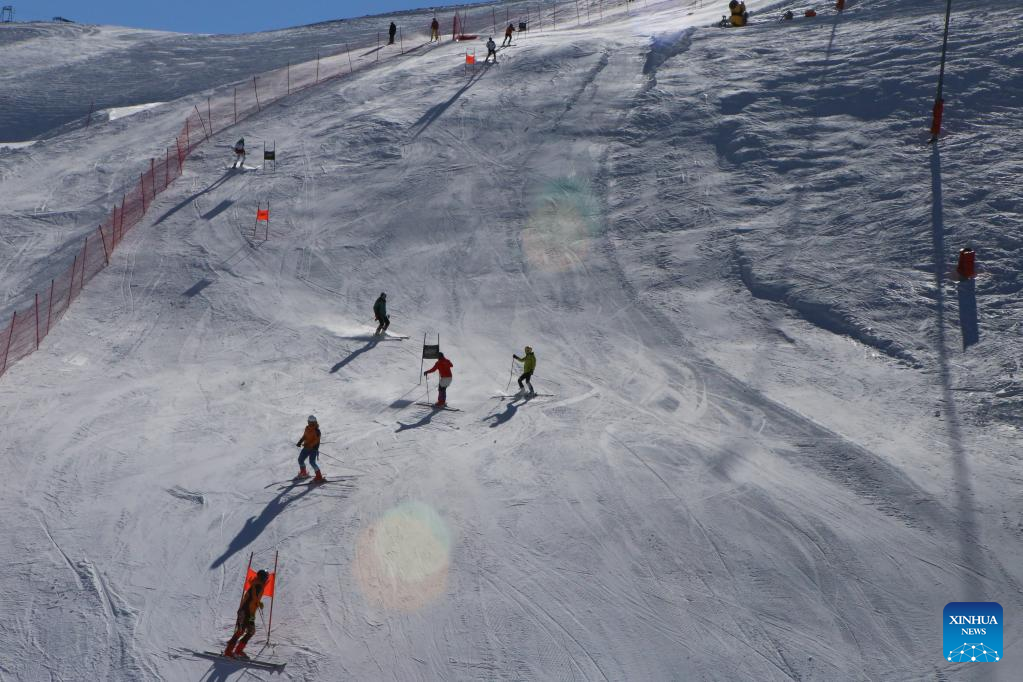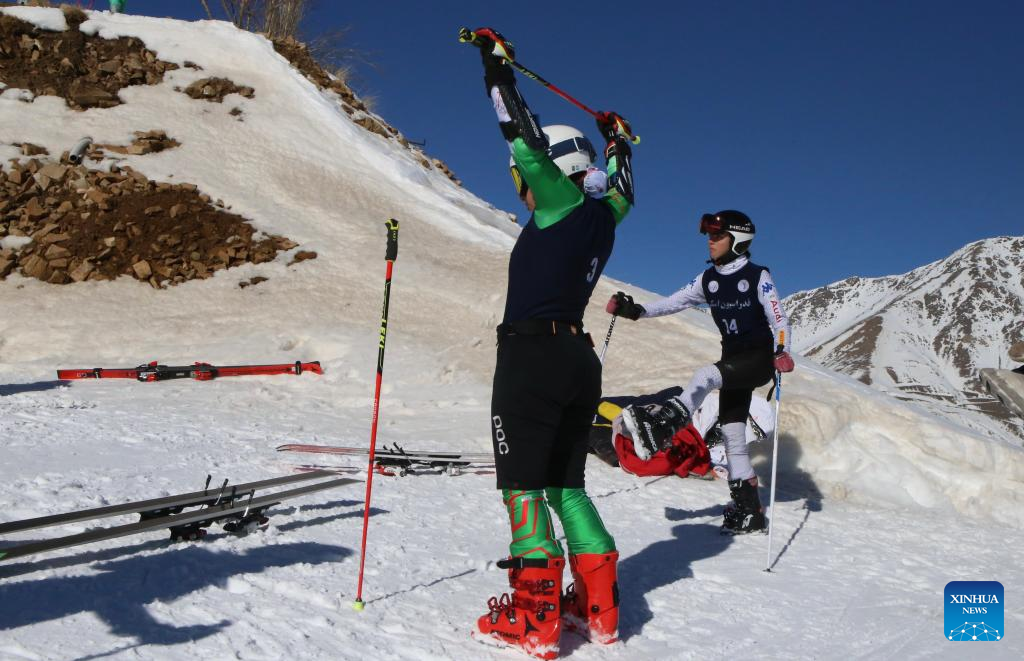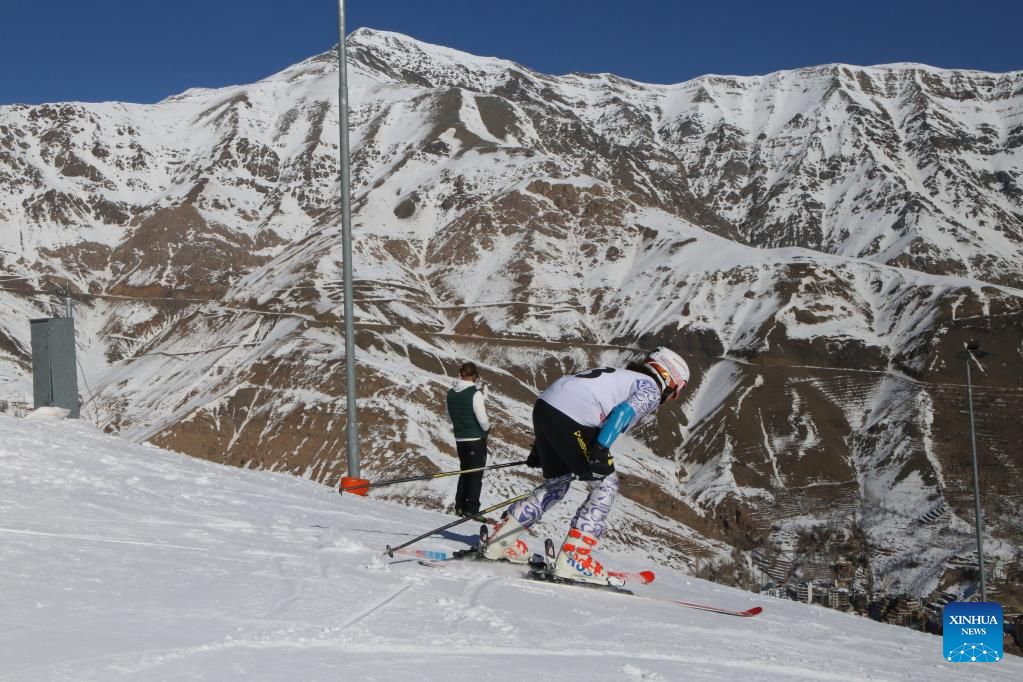 Competitors warm up before a qualification competition for the Olympics held by Iran's national skiing team at the Darbandsar Ski Resort in Tehran, Iran, Jan. 9, 2022. (Xinhua/Gao Wencheng)