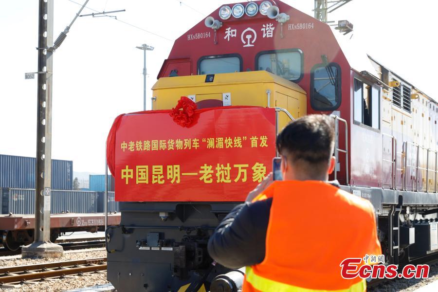 The first Lancang-Mekong Express freight train of the China-Laos Railway, loaded with goods including flowers and vegetables, left Kunming on Monday.