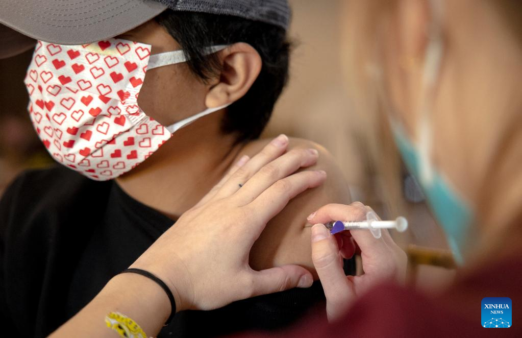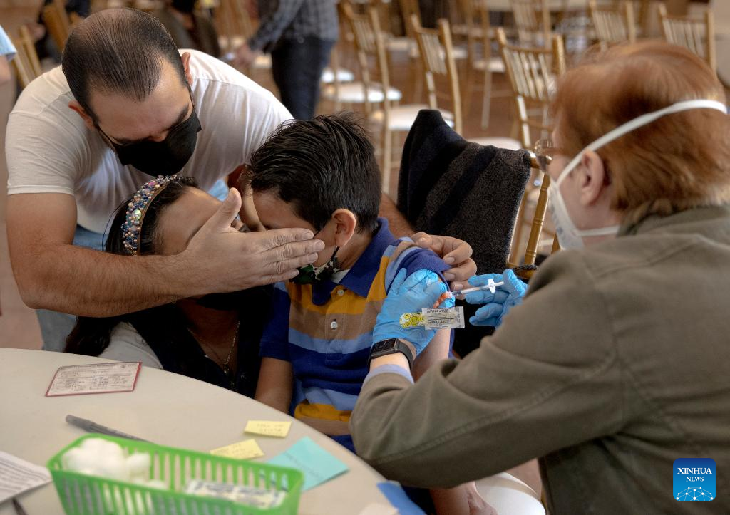 Parents comfort their son as the boy receiving a dose of COVID-19 vaccine at a vaccine clinic in San Antonio, Texas, the United States, Jan. 9, 2022. The Omicron variant has driven a new surge of COVID-19 cases in Texas. (Photo by Nick Wagner/Xinhua)