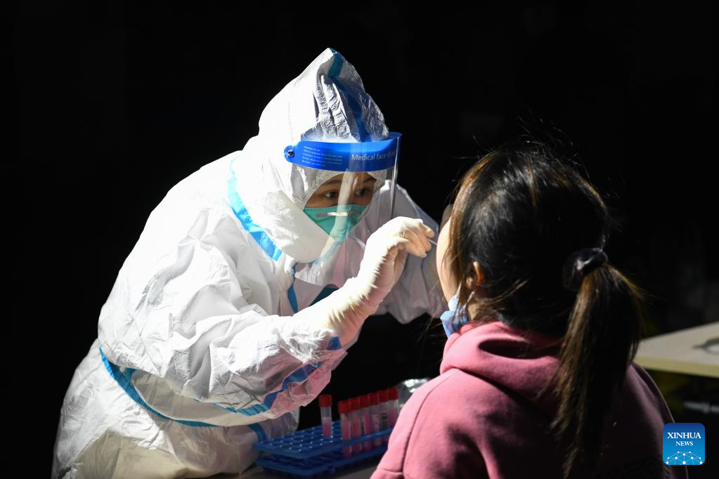 A citizen receives a nucleic acid test at a testing site in Futian District of Shenzhen, south China's Guangdong Province, Jan. 11, 2022. (Xinhua/Liang Xu)
