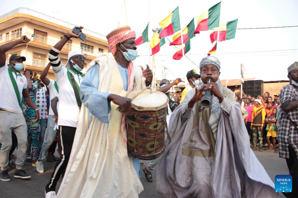 People take part in a parade during the fifth International Festival of Porto-Novo in Porto-Novo, Benin, on Jan. 10, 2022. (Photo by Seraphin Zounyekpe/Xinhua)