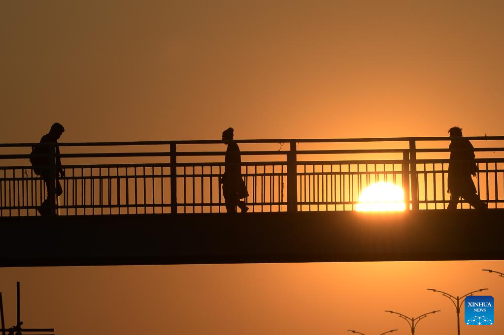 Photo taken on Jan. 11, 2022 shows the silhouette of people walking on a bridge during sunset in Islamabad, capital of Pakistan. (Xinhua/Ahmad Kamal)