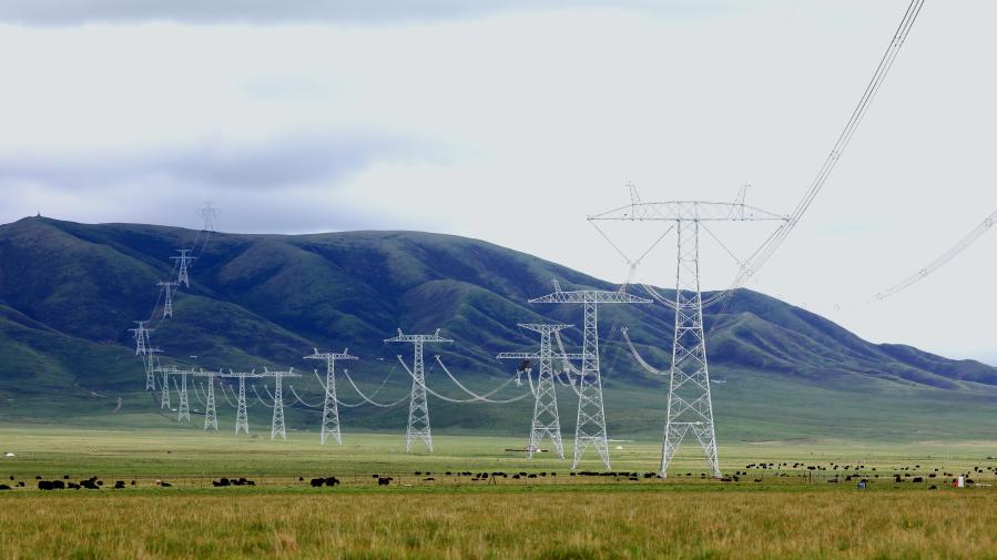 Photo taken on June 17, 2021, shows part of the Qinghai-Henan UHV DC power transmission line in Henan Mongolian Autonomous County of Huangnan Tibetan Autonomous Prefecture, northwest China's Qinghai Province. (Photo by Xie Lirong/Xinhua)