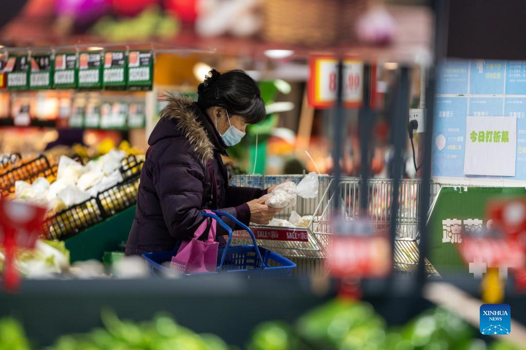A customer selects goods at a market in Nanjing, east China's Jiangsu Province, Jan. 12, 2022. (Photo by Su Yang/Xinhua)