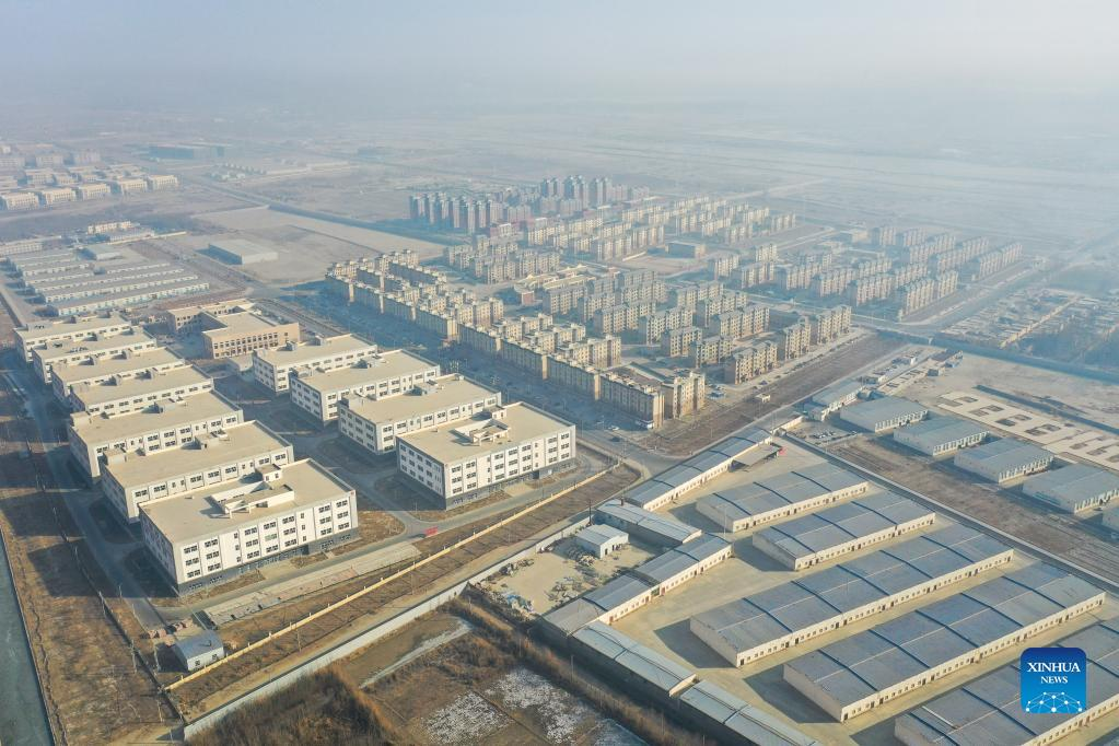 Aerial photo taken on Jan. 11, 2022 shows the integrated industrial park in Moyu County of Hotan, northwest China's Xinjiang Uygur Autonomous Region. Located on the southern brim of the Taklimakan Desert, Moyu was once an impoverished county with little arable land and weak industrial foundation. In recent years, Moyu County made efforts to attract investment as the booster of industrial development, constantly optimizes the industrial structure, and builds an integrated industrial park with the whole industrial chain of hosiery and electronics, effectively promoting economic development and increasing the income of local people. Up to now, the integrated industrial park in Moyu County has settled 17 enterprises and has offered more than 3,000 jobs. (Xinhua/Ding Lei)