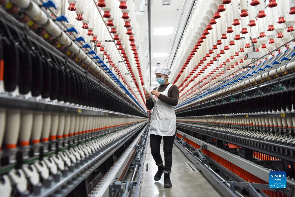 A staff member works in a textile factory at the integrated industrial park in Moyu County of Hotan, northwest China's Xinjiang Uygur Autonomous Region, Jan. 11, 2022. Located on the southern brim of the Taklimakan Desert, Moyu was once an impoverished county with little arable land and weak industrial foundation. In recent years, Moyu County made efforts to attract investment as the booster of industrial development, constantly optimizes the industrial structure, and builds an integrated industrial park with the whole industrial chain of hosiery and electronics, effectively promoting economic development and increasing the income of local people. Up to now, the integrated industrial park in Moyu County has settled 17 enterprises and has offered more than 3,000 jobs. (Xinhua/Ding Lei)