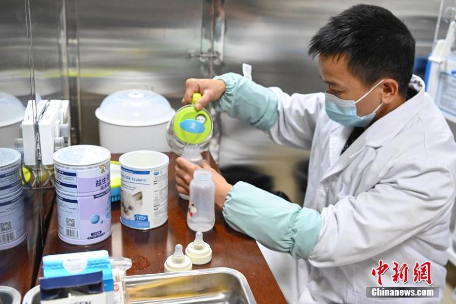 A care worker makes formula exclusive to the twin cubs, January 12, 2022. (Photo: China News Service/Chen Jimin)