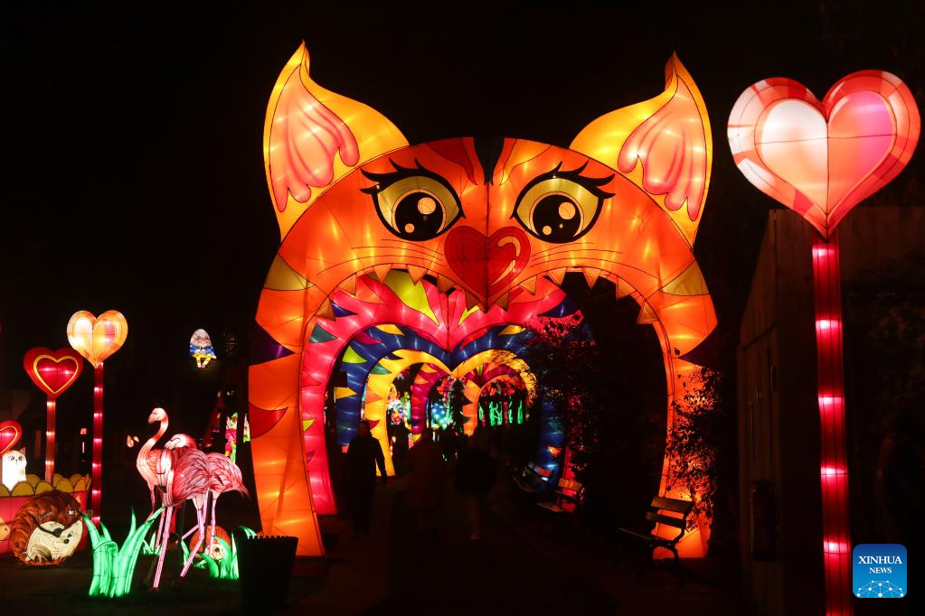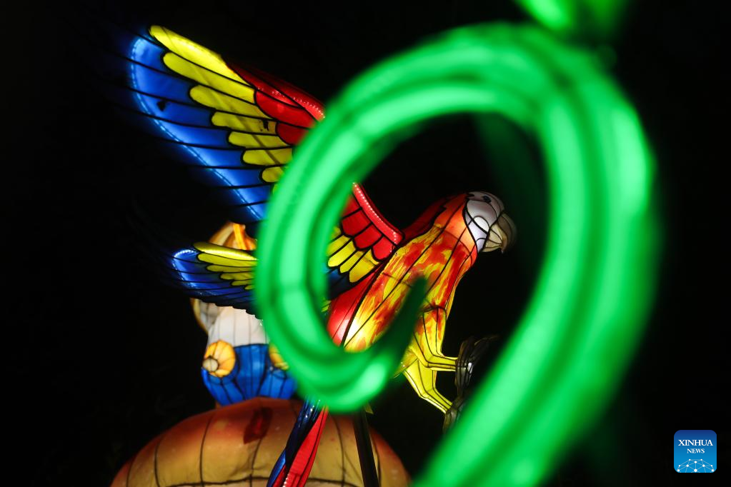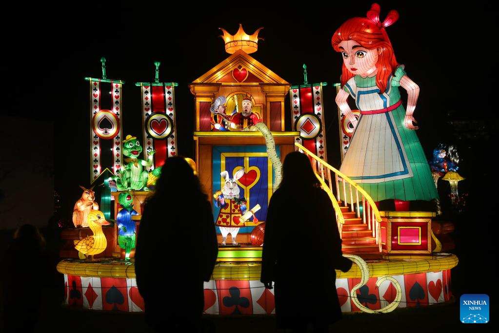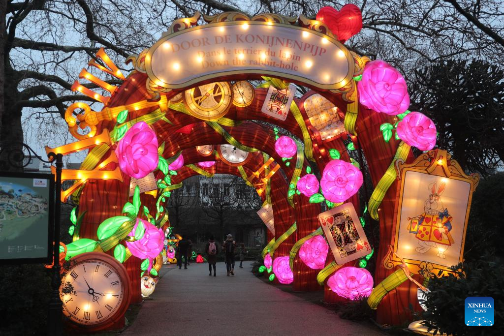 Light installations are pictured during the sixth edition of China light festival themed "Alice in Wonderland" at the Antwerp Zoo in Antwerp, Belgium, Jan. 12, 2022. (Xinhua/Zheng Huansong)