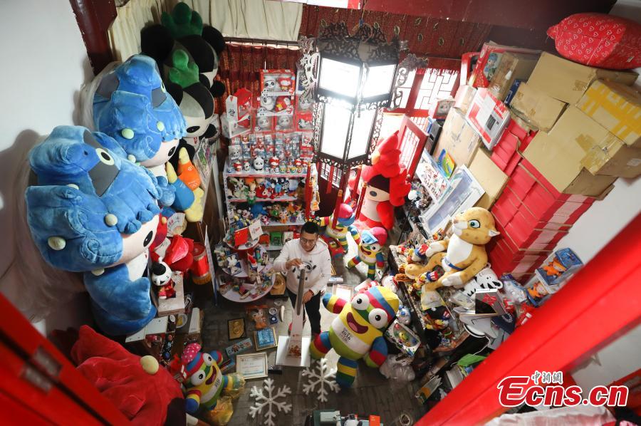 Zhang Wenquan arranges Olympic souvenirs, January 12, 2022, Beijing. (Photo: China News Service/Zhao Juan)