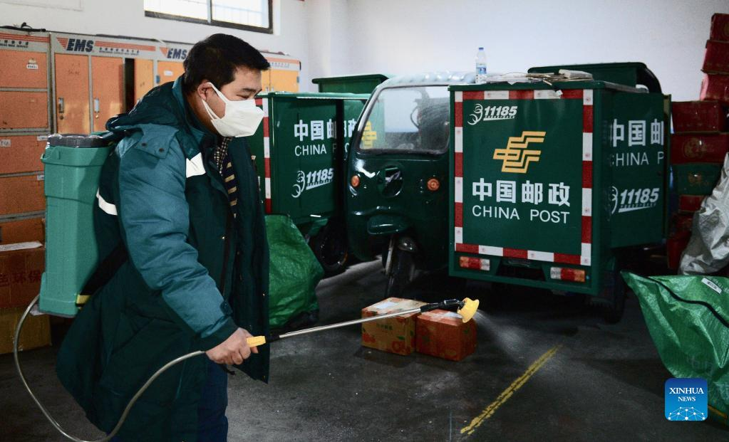 A staff member from a branch of China Post disinfects the warehouse in Xi'an, capital of northwest China's Shaanxi Province, Jan. 13, 2022. Postal and express delivery services in Xi'an have been gradually resumed in an orderly manner with strengthened epidemic prevention measures amid the latest resurgence. (Photo by Zou Jingyi/Xinhua)