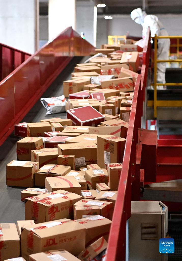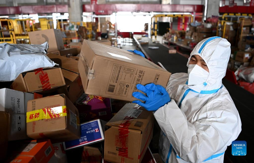 Staff members sort packages at a logistics center in Xi'an, capital of northwest China's Shaanxi Province, Jan. 13, 2022. Postal and express delivery services in Xi'an have been gradually resumed in an orderly manner with strengthened epidemic prevention measures amid the latest resurgence. (Xinhua/Liu Xiao)