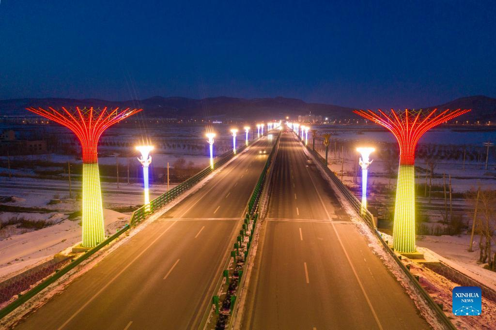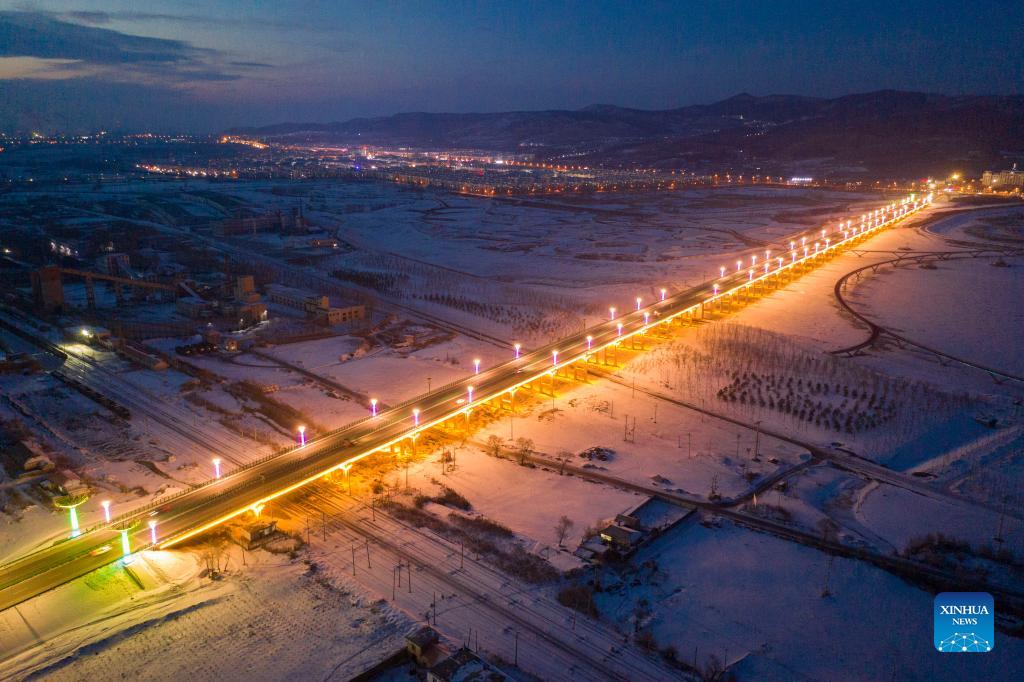 Aerial photo taken on Jan. 12, 2022 shows the "champion bridge" in Qitaihe City, northeast China's Heilongjiang Province. To date, six of China's 13 Winter Olympic gold medals have been claimed by athletes trained in Qitaihe City. The city has been stepping up efforts to train winter sports talents in recent years by building schools that teach short track speed skating, setting up training base for provincial sports team, as well as holding ice and snow sports events. (Xinhua/Xie Jianfei)