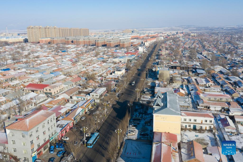 Aerial photo taken on Jan. 12, 2022 shows a street named after China's first Winter Olympic champion Yang Yang in Qitaihe City, northeast China's Heilongjiang Province. To date, six of China's 13 Winter Olympic gold medals have been claimed by athletes trained in Qitaihe City. The city has been stepping up efforts to train winter sports talents in recent years by building schools that teach short track speed skating, setting up training base for provincial sports team, as well as holding ice and snow sports events. (Xinhua/Xie Jianfei)
