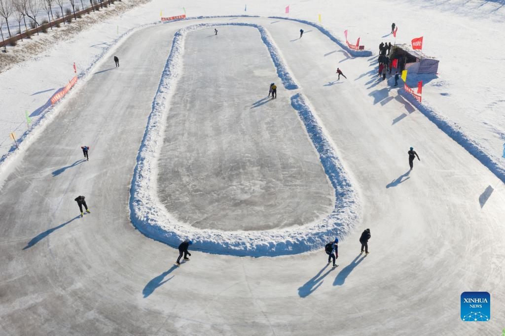 Aerial photo taken on Jan. 12, 2022 shows enthusiasts skating on an ice rink in Qitaihe City, northeast China's Heilongjiang Province. To date, six of China's 13 Winter Olympic gold medals have been claimed by athletes trained in Qitaihe City. The city has been stepping up efforts to train winter sports talents in recent years by building schools that teach short track speed skating, setting up training base for provincial sports team, as well as holding ice and snow sports events. (Xinhua/Xie Jianfei)