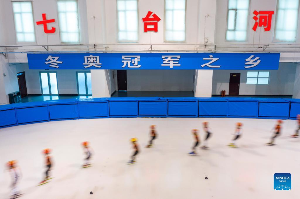 Aerial photo taken on Jan. 10, 2022 shows students of a vocational college taking part in short track speed skating training at Qitaihe Sports Center in Qitaihe City, northeast China's Heilongjiang Province. To date, six of China's 13 Winter Olympic gold medals have been claimed by athletes trained in Qitaihe City. The city has been stepping up efforts to train winter sports talents in recent years by building schools that teach short track speed skating, setting up training base for provincial sports team, as well as holding ice and snow sports events. (Xinhua/Xie Jianfei)