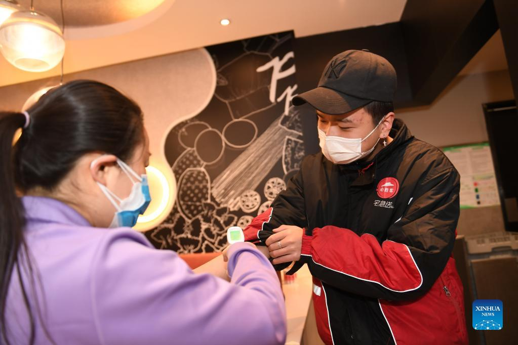 A staff member checks the body temperature of a deliveryman (R) at a restaurant in Xi'an, capital of northwest China's Shaanxi Province, Jan. 13, 2022. Local authorities advance the orderly resumption of catering service as the city is witnessing a continuing drop of local COVID-19 cases amid the latest resurgence. Catering enterprises will receive take-out orders with COVID-19 prevention measures but dine-in services will remain suspended. (Xinhua/Li Yibo)