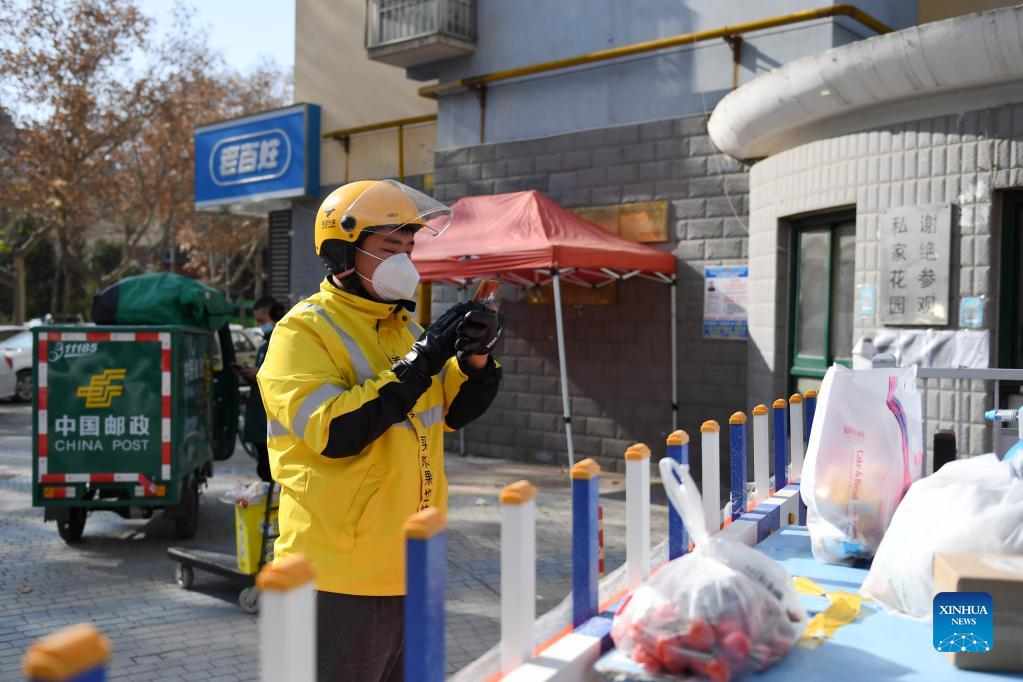 Delivery man Kong Weijian delivers food to customers in a non-contact way in Xi'an, capital of northwest China's Shaanxi Province, Jan. 12, 2022. Local authorities advance the orderly resumption of catering service as the city is witnessing a continuing drop of local COVID-19 cases amid the latest resurgence. Catering enterprises will receive take-out orders with COVID-19 prevention measures but dine-in services will remain suspended. (Xinhua/Li Yibo)
