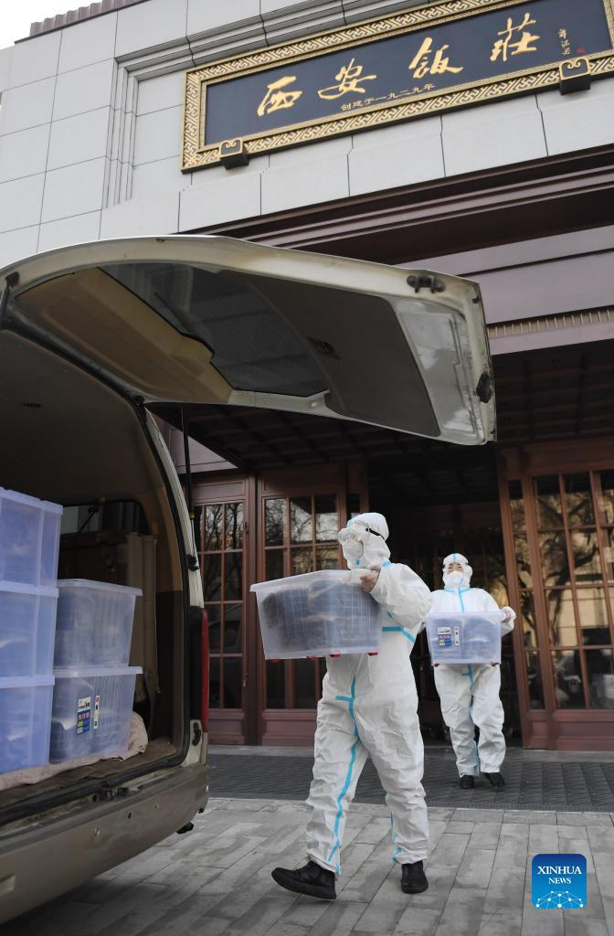 Staff members load takeout food onto a truck at a restaurant in Xi'an, capital of northwest China's Shaanxi Province, Jan. 13, 2022. Local authorities advance the orderly resumption of catering service as the city is witnessing a continuing drop of local COVID-19 cases amid the latest resurgence. Catering enterprises will receive take-out orders with COVID-19 prevention measures but dine-in services will remain suspended. (Xinhua/Li Yibo)