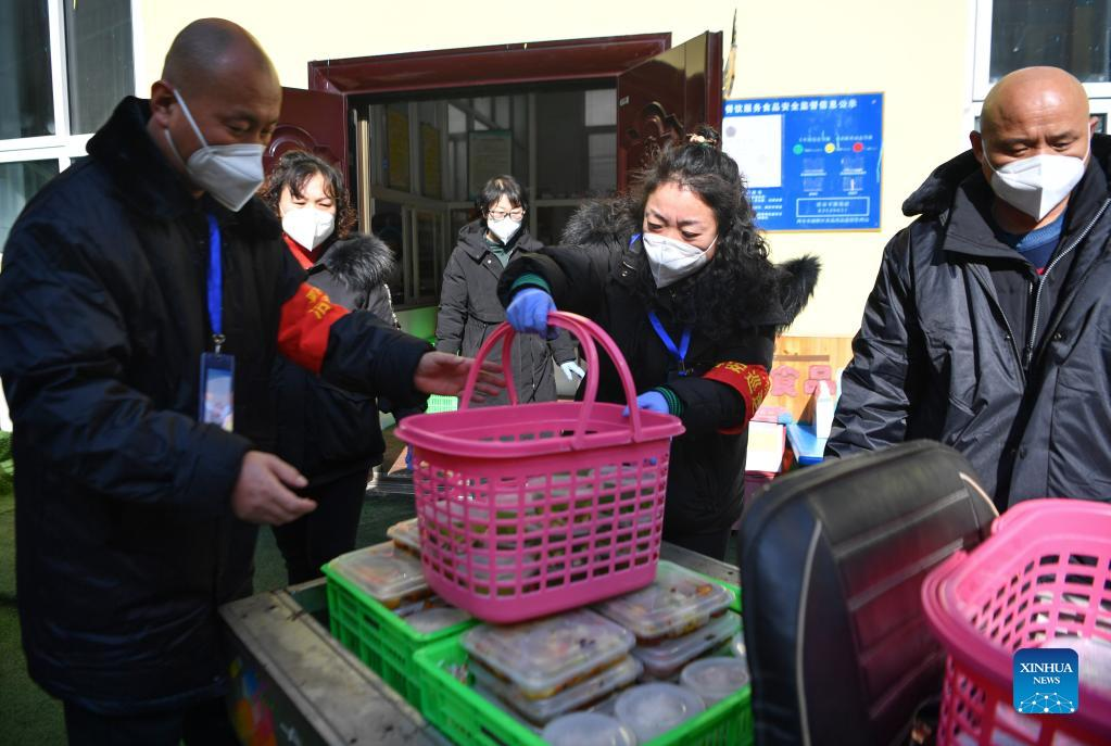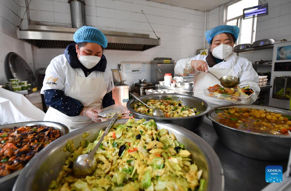 Staff members prepare to deliver lunch to residents in Sanjia Village of Baqiao District in Xi'an, capital of northwest China's Shaanxi Province, Jan. 12, 2022. Located in Baqiao District of Xi'an, Sanjia Village is an "urban village" inhabited by floating population such as migrant workers. An activity organized to provide two meals for free to residents in need was carried out in the village after the city has been hit by the recent COVID-19 resurgence. (Xinhua/Zhang Bowen)