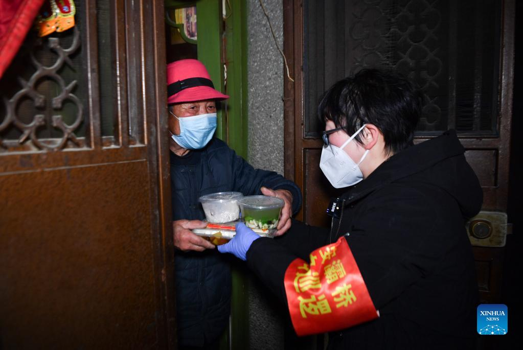 A staff member delivers lunch to a senior citizen who lives alone in Sanjia Village of Baqiao District in Xi'an, capital of northwest China's Shaanxi Province, Jan. 12, 2022. Located in Baqiao District of Xi'an, Sanjia Village is an "urban village" inhabited by floating population such as migrant workers. An activity organized to provide two meals for free to residents in need was carried out in the village after the city has been hit by the recent COVID-19 resurgence. (Xinhua/Zhang Bowen)