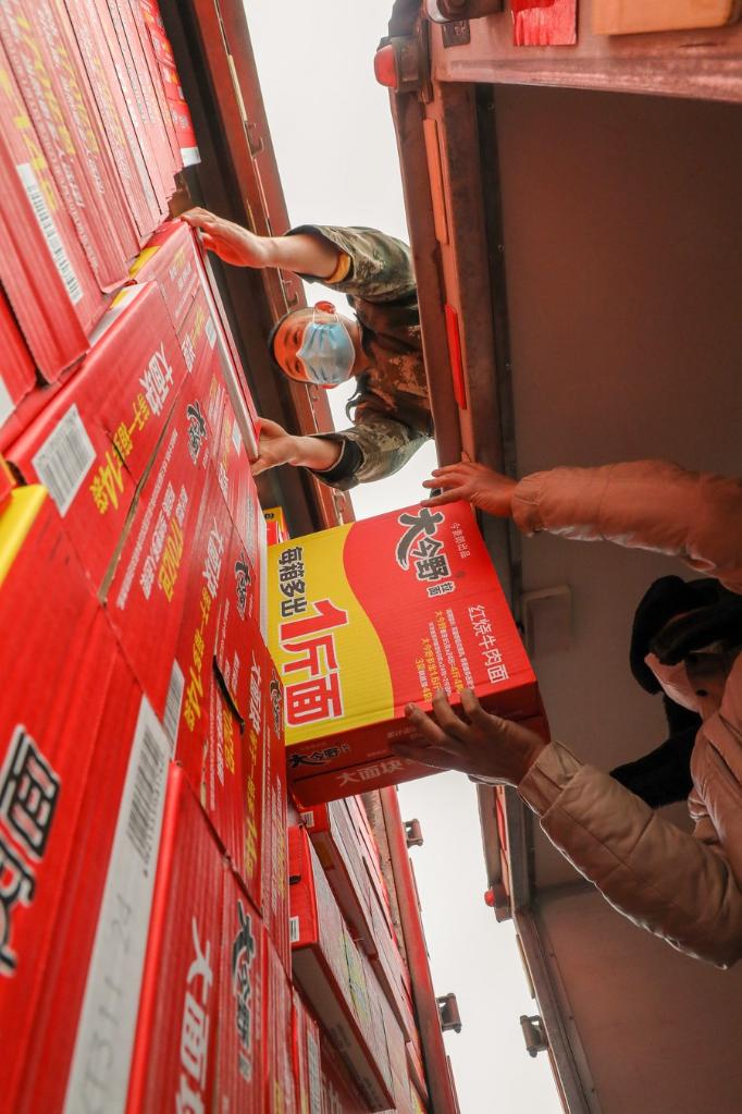 Workers distribute daily necessities at a goods transferring point in Anyang of central China's Henan Province, Jan. 14, 2022. (Photo by Ma Xiaoran/Xinhua)