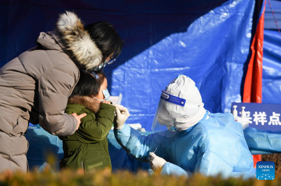 A medical worker takes a swab sample from a child for nucleic acid test at a COVID-19 testing site in north China's Tianjin, Jan. 15, 2022. North China's Tianjin Municipality launched the third round of citywide nucleic acid testing at 7 a.m. Saturday. (Xinhua/Sun Fanyue)