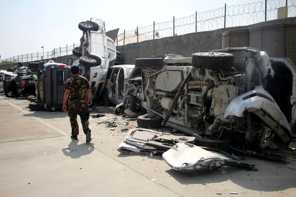 A Taliban member walks past damaged vehicles at the Kabul airport in Kabul, capital of Afghanistan, Sept. 20, 2021. The Kabul airport was damaged with its many facilities destroyed during the withdrawal of the last U.S.-led forces and U.S.-led evacuation flights in late August 2021. (Photo by Saifurahman Safi/Xinhua)