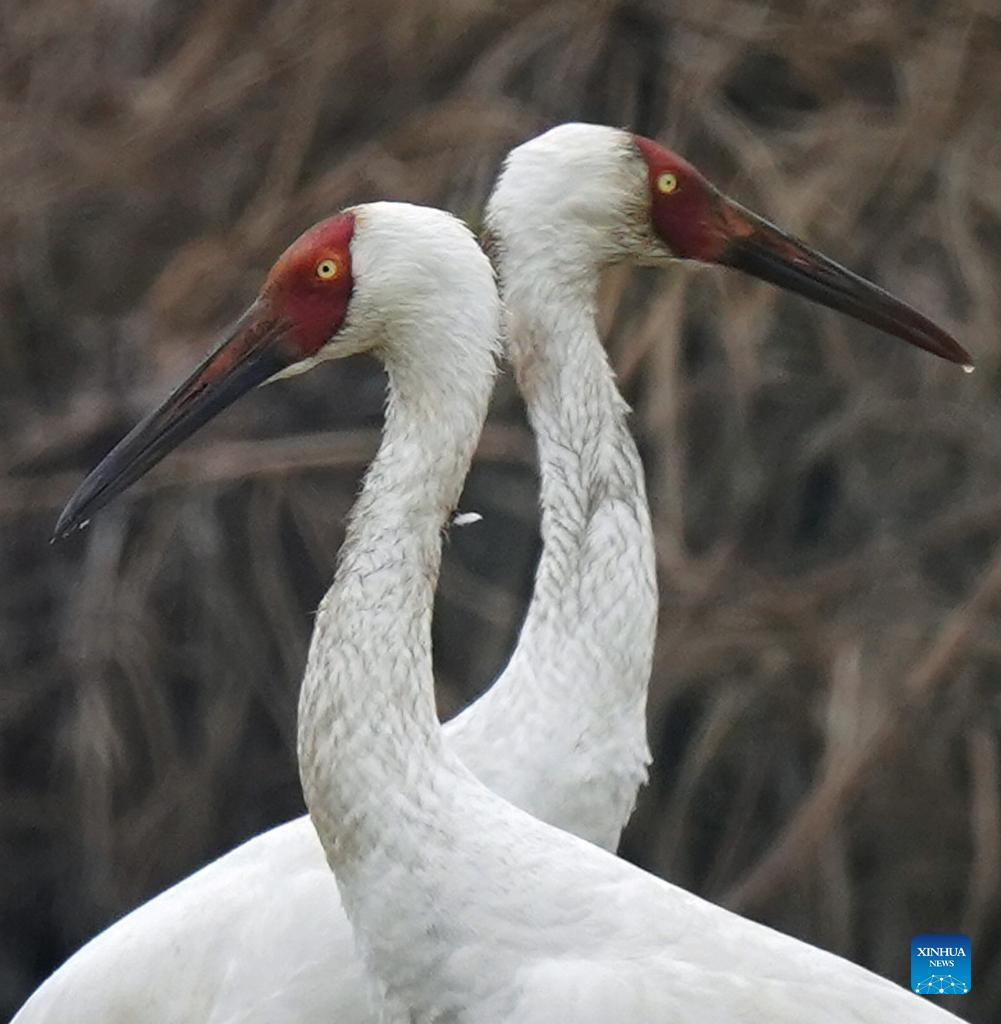 White cranes are seen at Nanchang Five Stars Siberian Cranes Sanctuary by the Poyang Lake in Nanchang, east China's Jiangxi Province, Jan. 12, 2022. Poyang Lake, the country's largest freshwater lake, is an important wintering spot for migratory birds. To ramp up forage supplies for the birds, in 2021, the local government of Yugan County issued a compensation policy for farmers, and reserved rice for migratory birds. In Nanchang Five Stars Siberian Cranes Sanctuary by the Poyang Lake, cranes have been attracted there for food on a lotus pond. The pond, initiated and invested in by bird lovers in 2017, is expected to provide enough food for the cranes in winter. With the support of local authorities, the pond is also developed into a base for scientific research and education, as well as for international exchanges. (Xinhua/Wan Xiang)