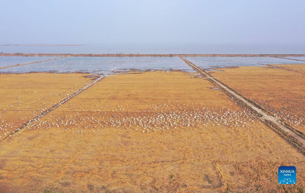 Aerial photo taken on Jan. 11, 2022 shows migratory birds forage at a paddy field in Yugan County, east China's Jiangxi Province. Poyang Lake, the country's largest freshwater lake, is an important wintering spot for migratory birds. To ramp up forage supplies for the birds, in 2021, the local government of Yugan County issued a compensation policy for farmers, and reserved rice for migratory birds. In Nanchang Five Stars Siberian Cranes Sanctuary by the Poyang Lake, cranes have been attracted there for food on a lotus pond. The pond, initiated and invested in by bird lovers in 2017, is expected to provide enough food for the cranes in winter. With the support of local authorities, the pond is also developed into a base for scientific research and education, as well as for international exchanges. (Xinhua/Wan Xiang)