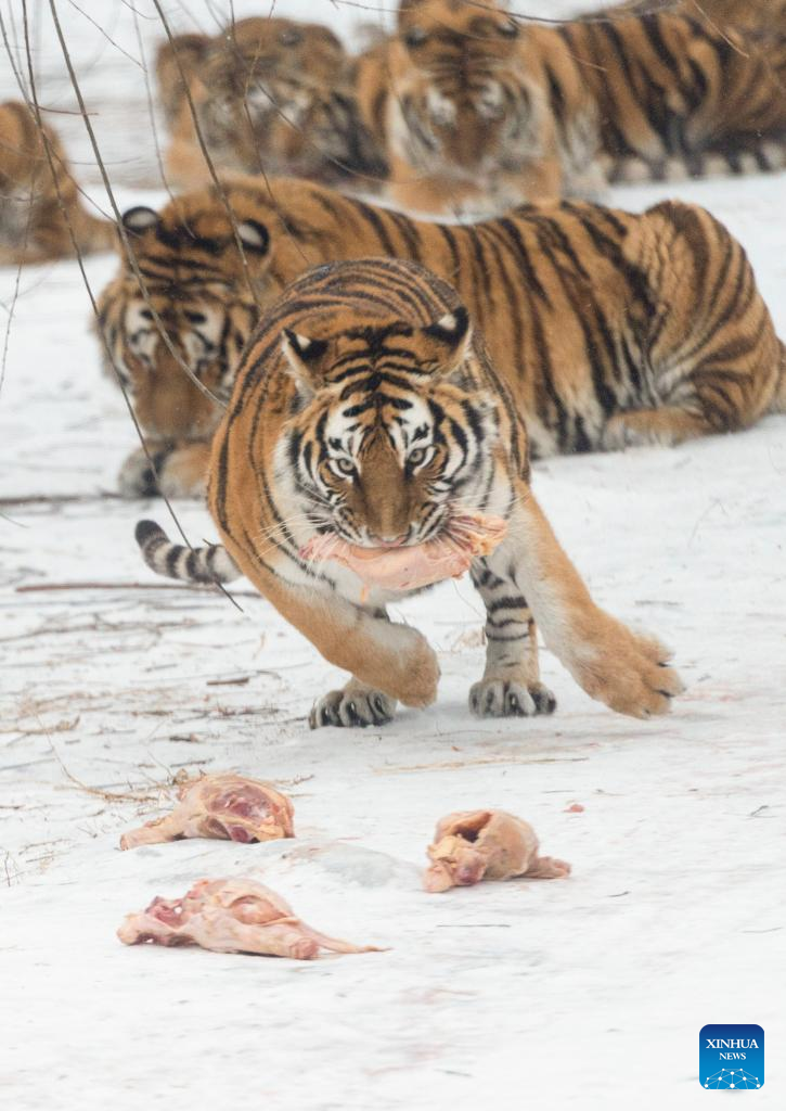 Photo taken on Jan. 15, 2022 shows Siberian tigers eating at the Siberian Tiger Park in northeast China's Heilongjiang Province. (Xinhua/Xie Jianfei)